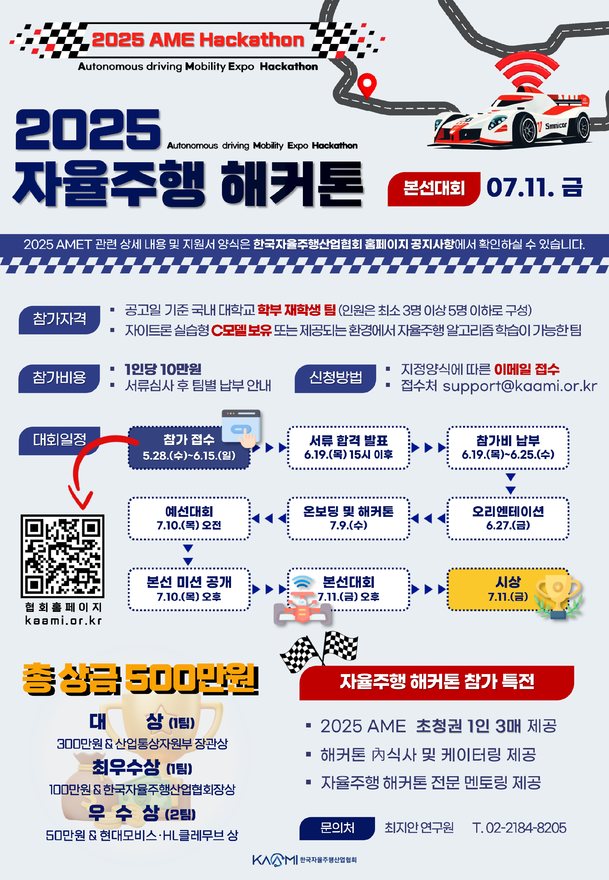 | 제목 | [한국자율주행산업협회] 2025 자율주행 해커톤 (AME Hackathon 2025) 경진대회 참가 홍보 | 날짜 | 2025-06-02 | 조회수 | 710 |
